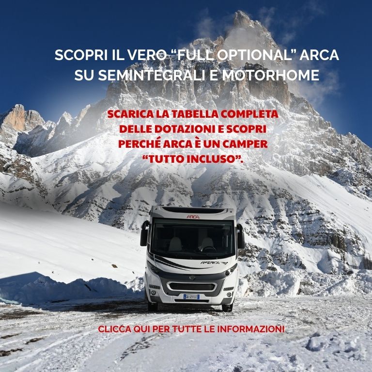 Innovazione tecnologica, sicurezza e amore per il plein air si fondono in ogni gioiello della gamma Arca, brand punto di riferimento nel mondo del camper, un esempio di tecnica, eleganza e classe. Arca diventa presto una filosofia: è sinonimo di ricercatezza, funzionalità e comfort.
