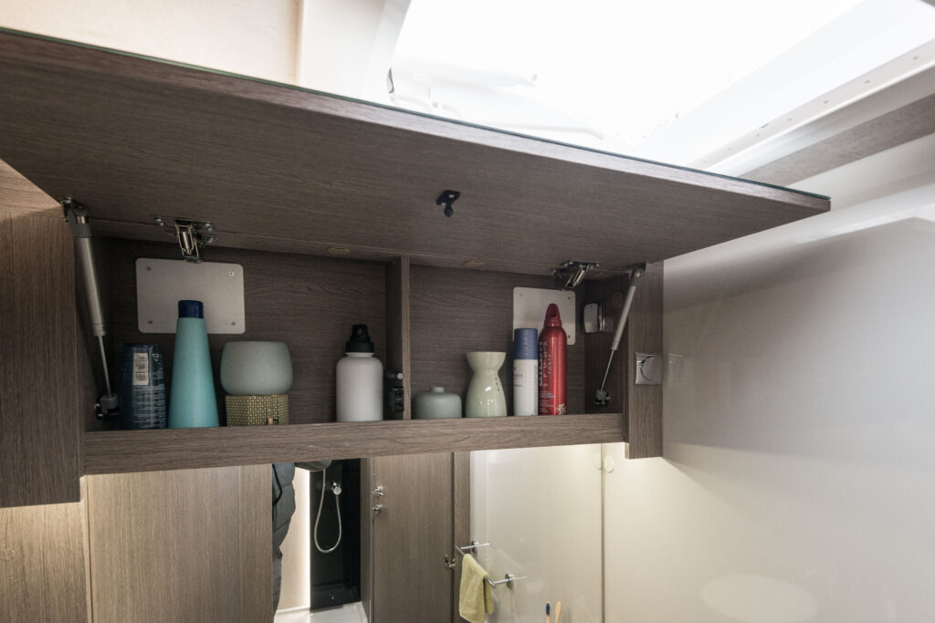 Lo schienale in legno dei pensili è distaccato dalla parete favorendo il ricircolo dell’aria. I pensili sospesi ed i mobili sono dotati di piccole feritoie che consentono il flusso laminare e continuo dell’aria contro le pareti ed il tetto evitando così ogni forma di condensa all’interno del veicolo.
