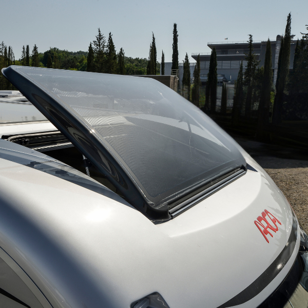 Piccoli lussi esaltano la quotidianità in camper: casse altoparlanti nella zona living, ampie finestre e tende a pacchetto, la luminosità dello skydome integrato, botole a pavimento, per 138 litri di stivaggio.