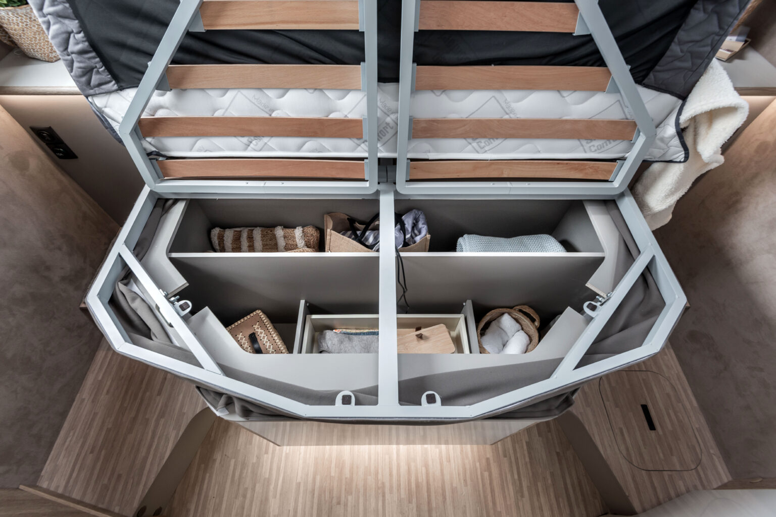 Il letto centrale è per Arca molto più di una soluzione abitativa: è la promessa di notti serene e risvegli pieni di energia. È il punto di partenza di ogni avventura, il luogo dove ritrovi te stesso dopo una giornata di viaggio, il tuo paradiso dove ricaricarsi in totale intimità, circondati da comfort e bellezza.