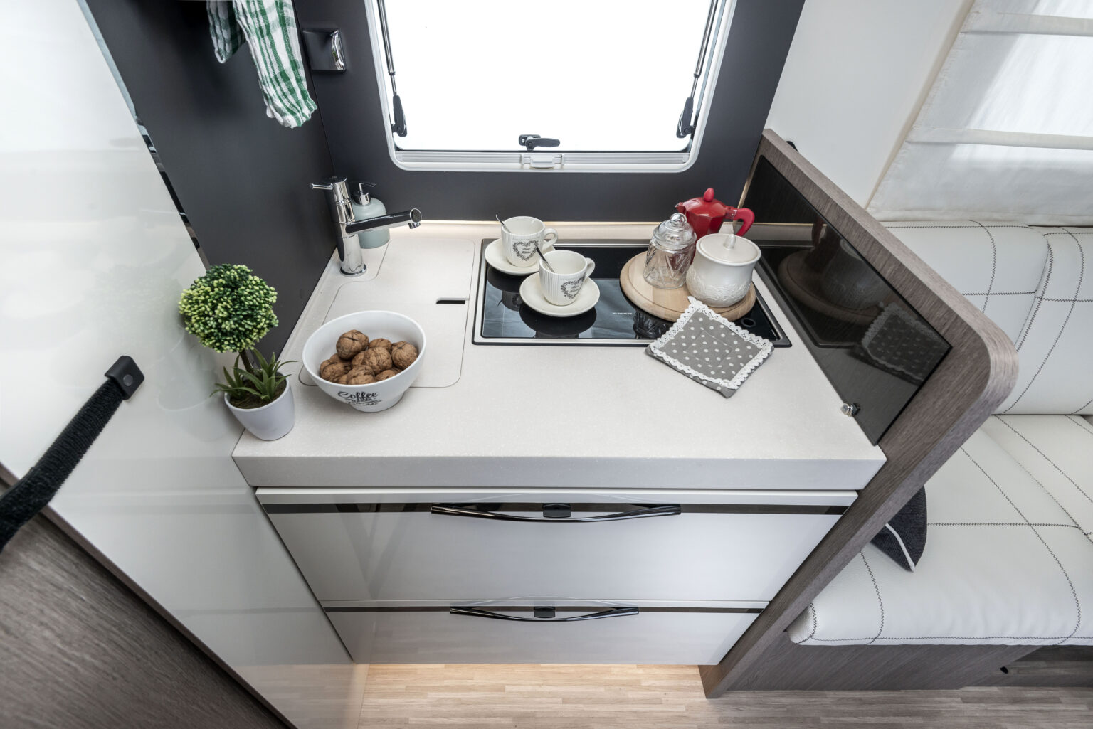 Semintegrale compatto 6,36 metri con maxi zona living anteriore, dinette face to face, toilette trasversale posteriore e grande armadio, 4 posti omologati. Nonostante le dimensioni ridotte il veicolo presenta due aree ben distinte: un maxi living accogliente completo di cucina, facilmente trasformabile nella zona notte dotata di maxi letto elettrico, che non impedisce l’uscita, e una toilette posteriore «trasversale» comoda e spaziosa che ospita un grande armadio multispazio e accesso al garage.